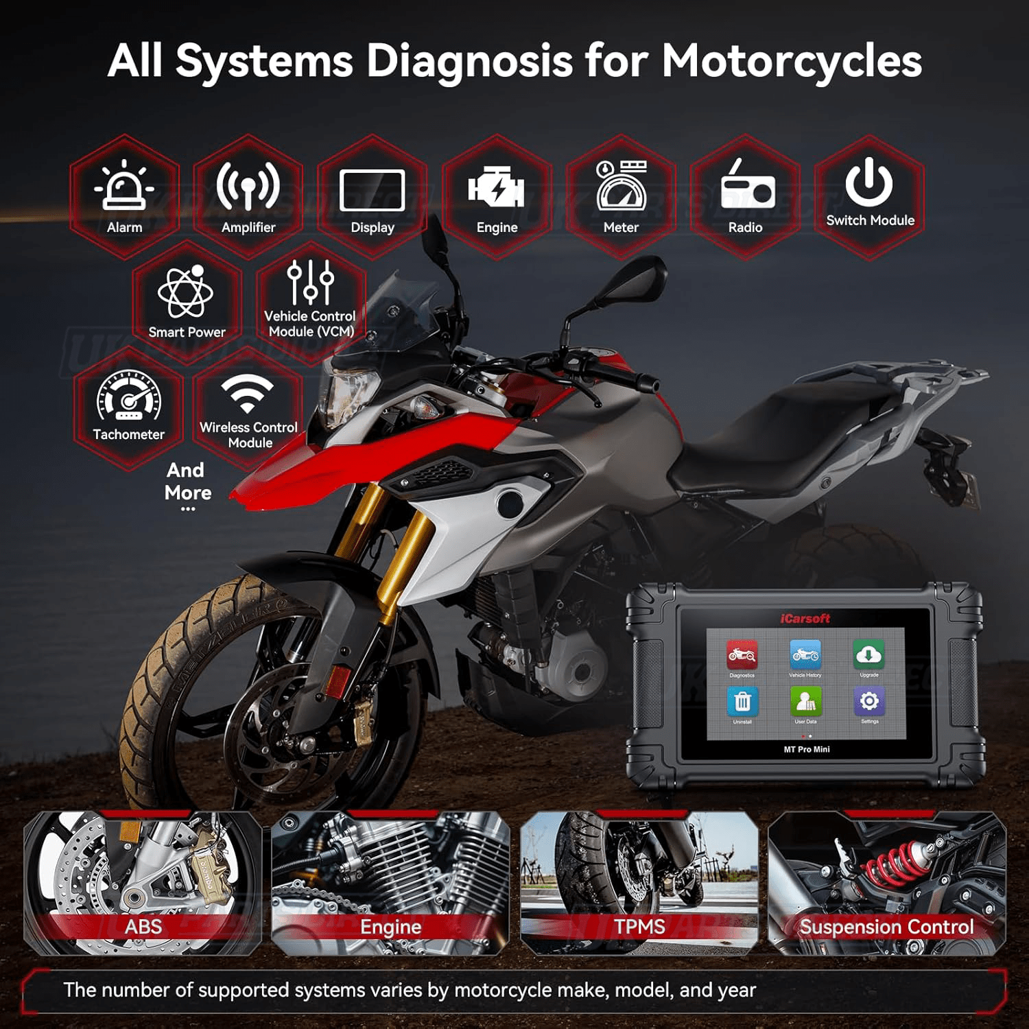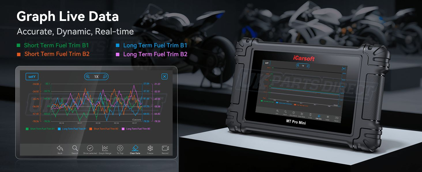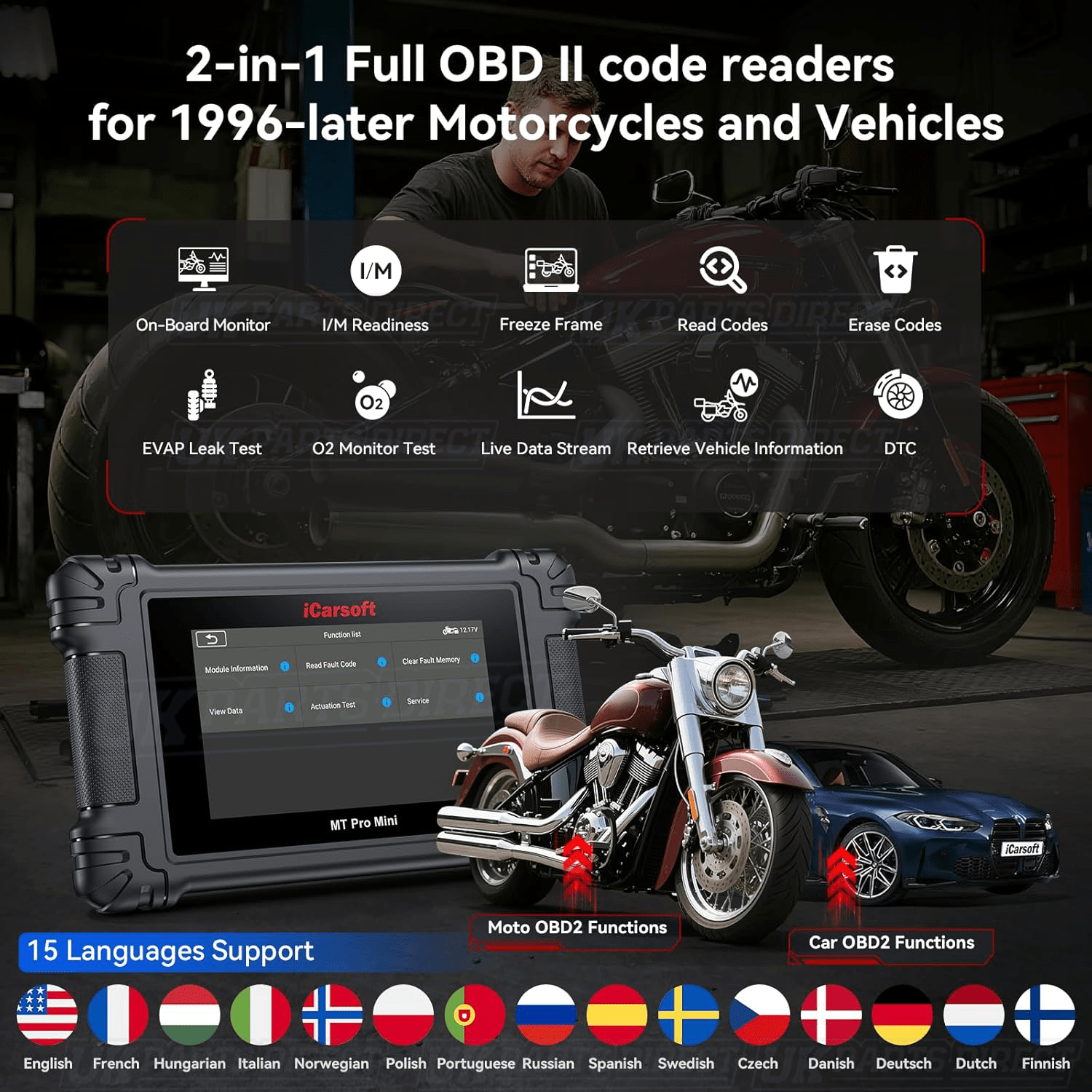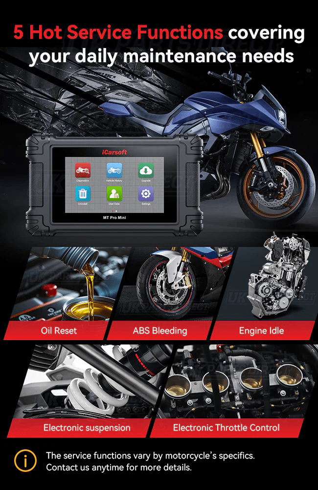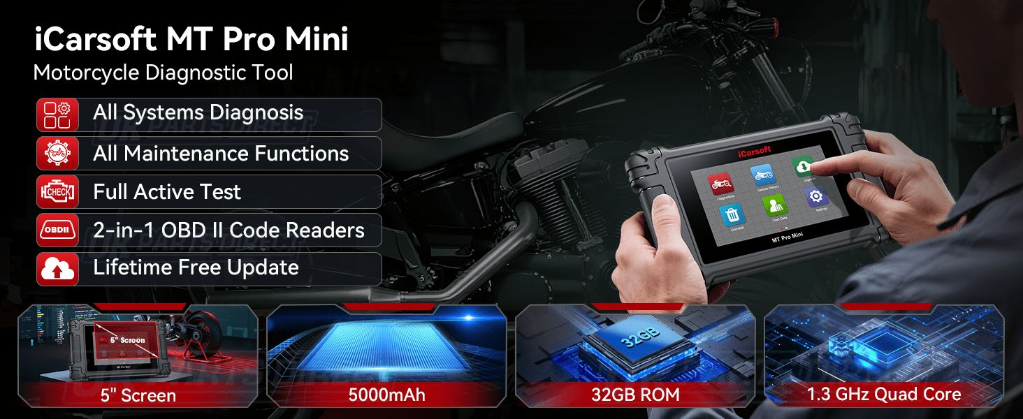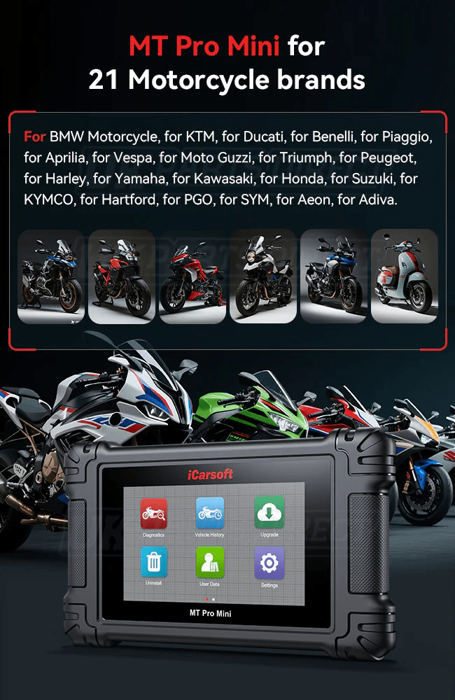 The iCarsoft MT PRO MINI Motorcycle Diagnostic Tool offers Full System Manufacturer Specific Diagnostics for 21 Motorcycle Brands.
