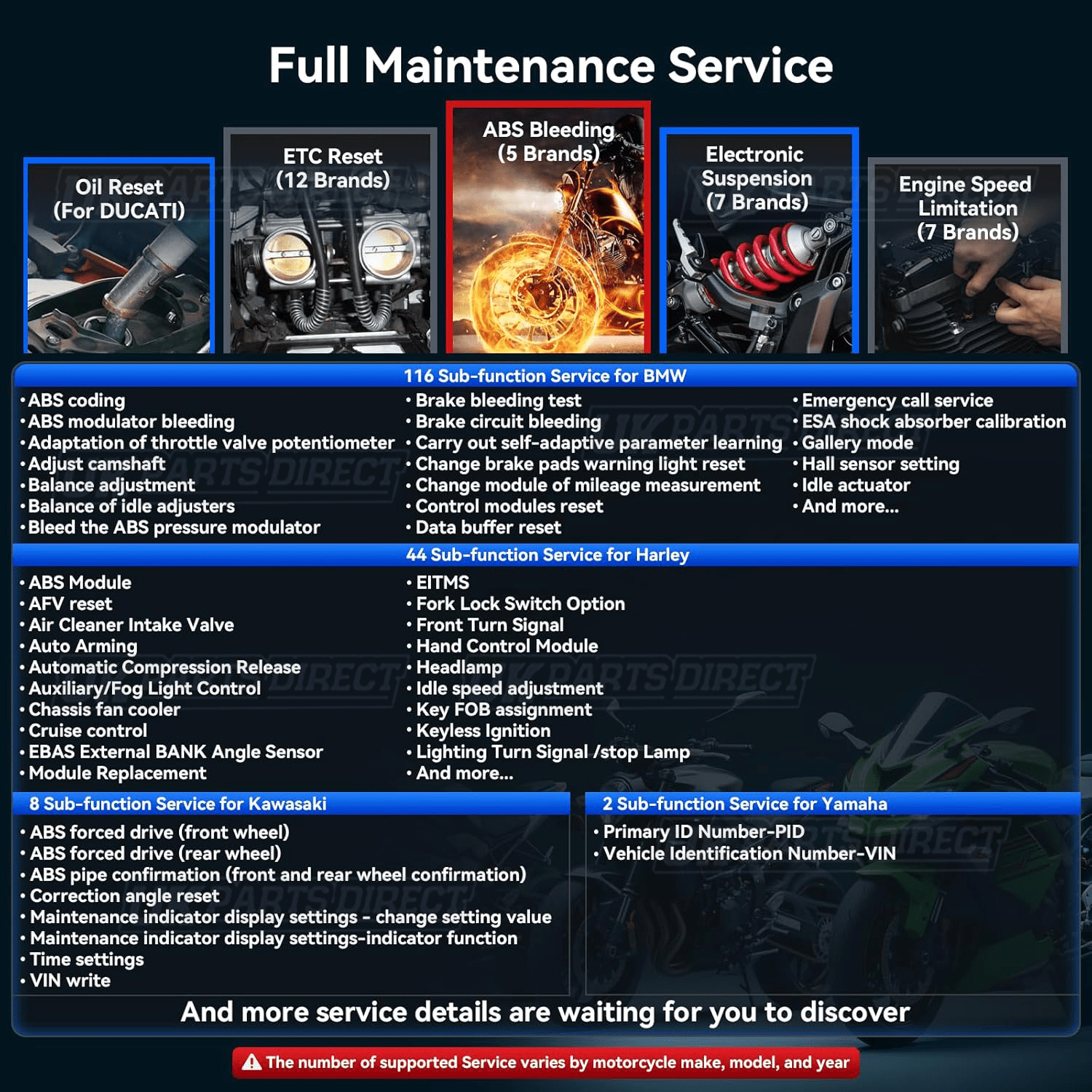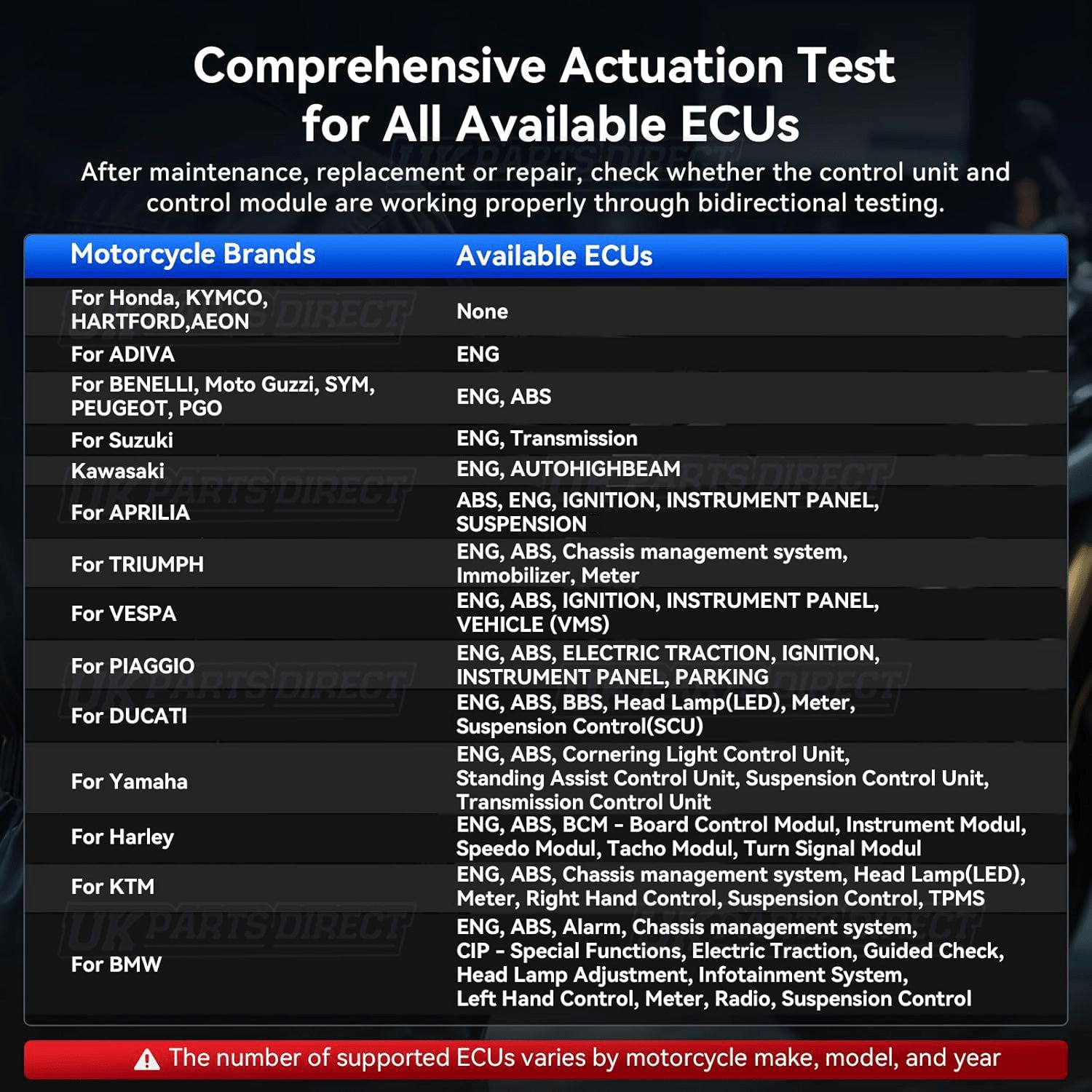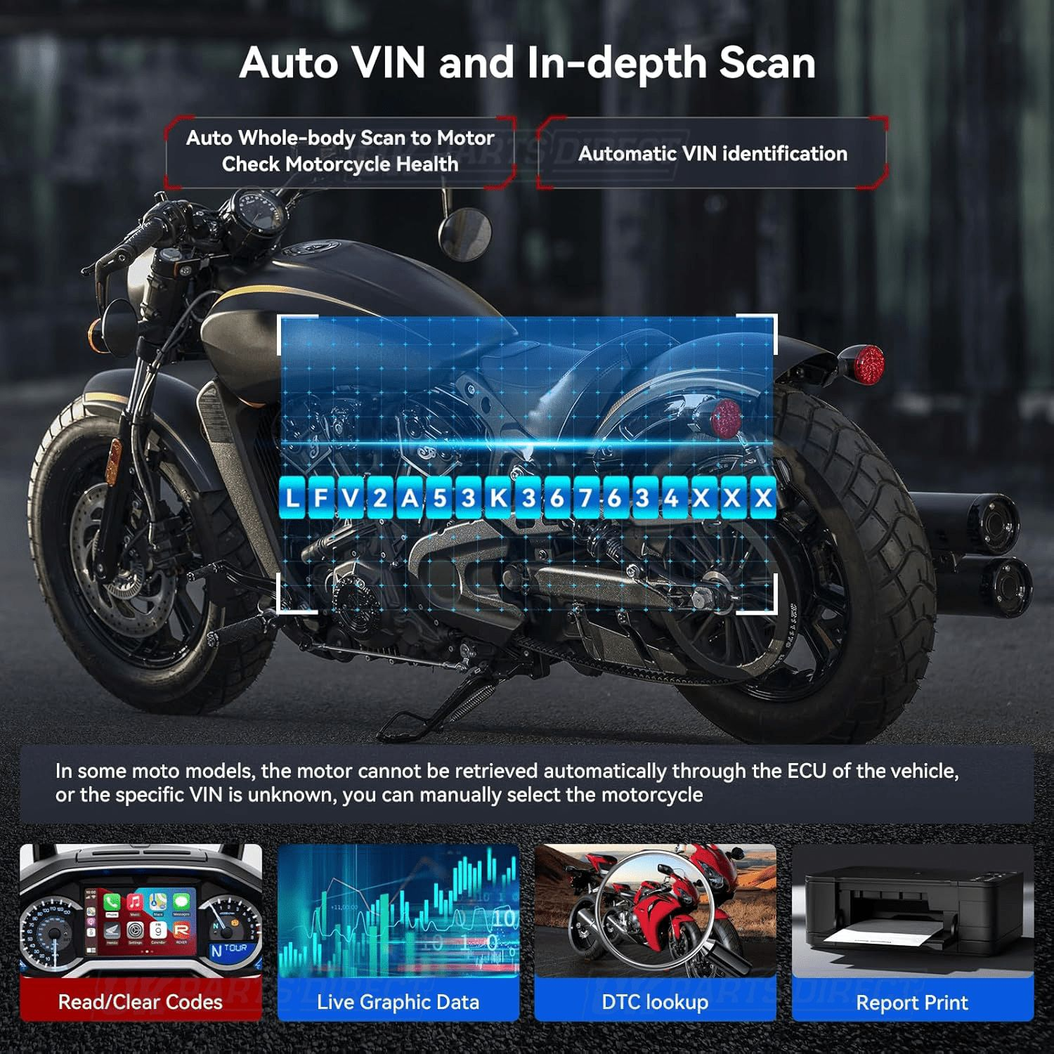 Offering detailed descriptions and likely reasons as to why the bike is showing Engine, ABS, Chassis, Electronic Suspension, Tyre TPMS and more Diagnostic Trouble Codes (DTC's) and the ability to remove and clear them. This is the solution at amazing value for money - enabling technicians to accurately diagnose complex problems.