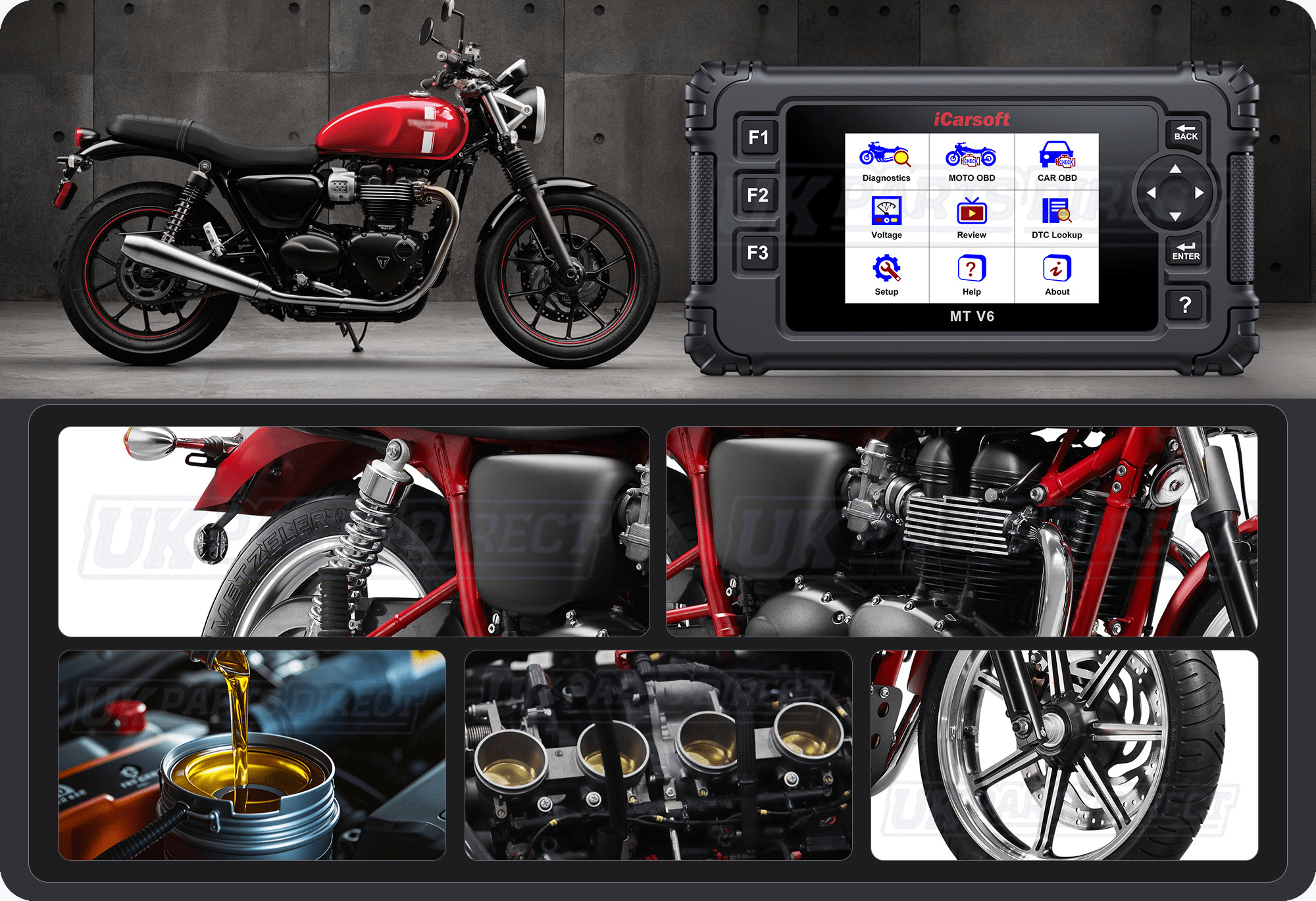 The iCarsoft MT V6 range of Motorcycle Diagnostic Tools offer Full System Manufacturer Specific Diagnostics. Avoiding costly visits to a dealership when you can diagnose, report and clear troublesome fault codes within minutes.