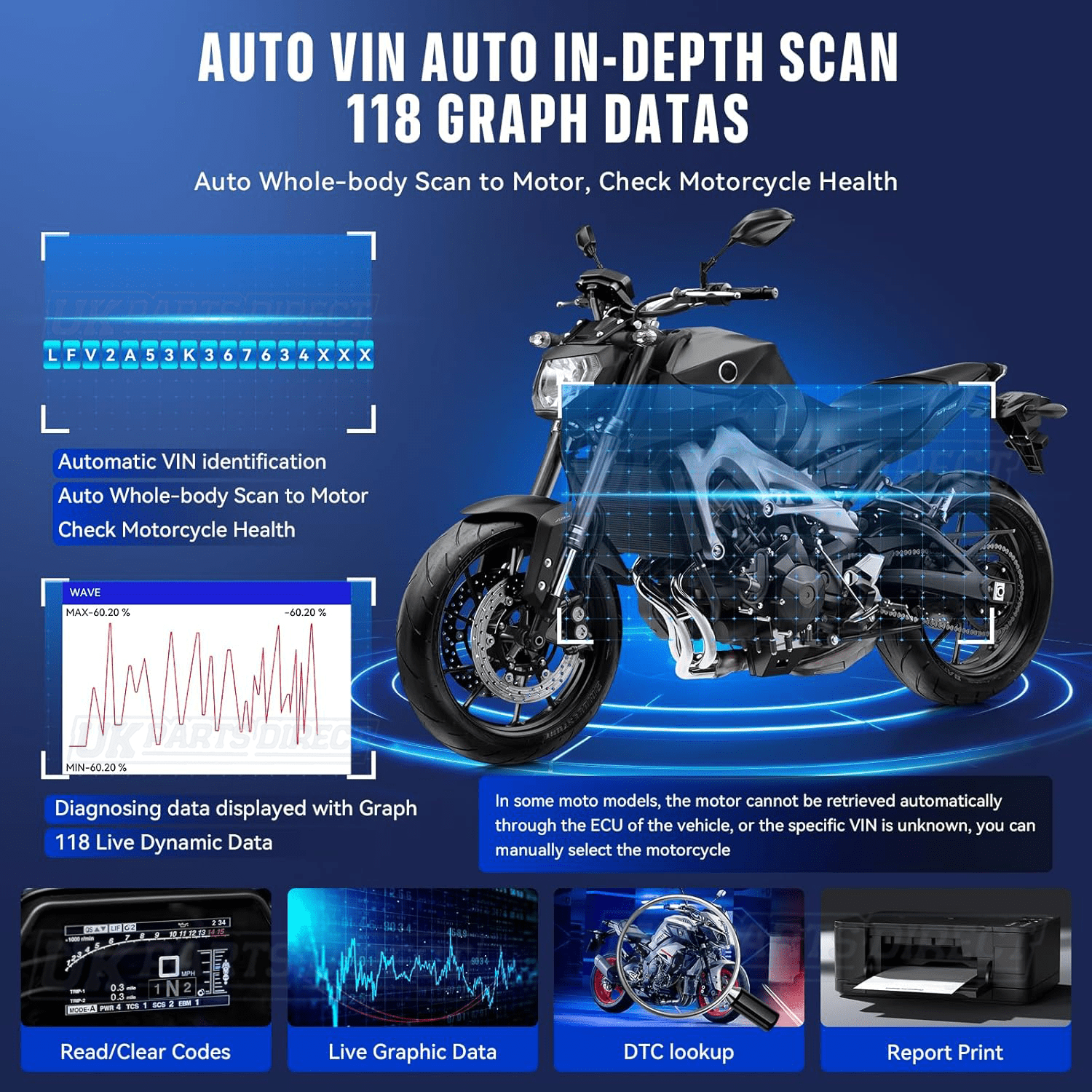 Offering detailed descriptions and likely reasons as to why your bike is showing Engine, ABS, Chassis, Electronic Suspension, Tyre TPMS and more Diagnostic Trouble Codes (DTC's) and the ability to remove and clear them. This is the solution at amazing value for money - enabling technicians to accurately diagnose complex problems and now enables you to easily do the same.