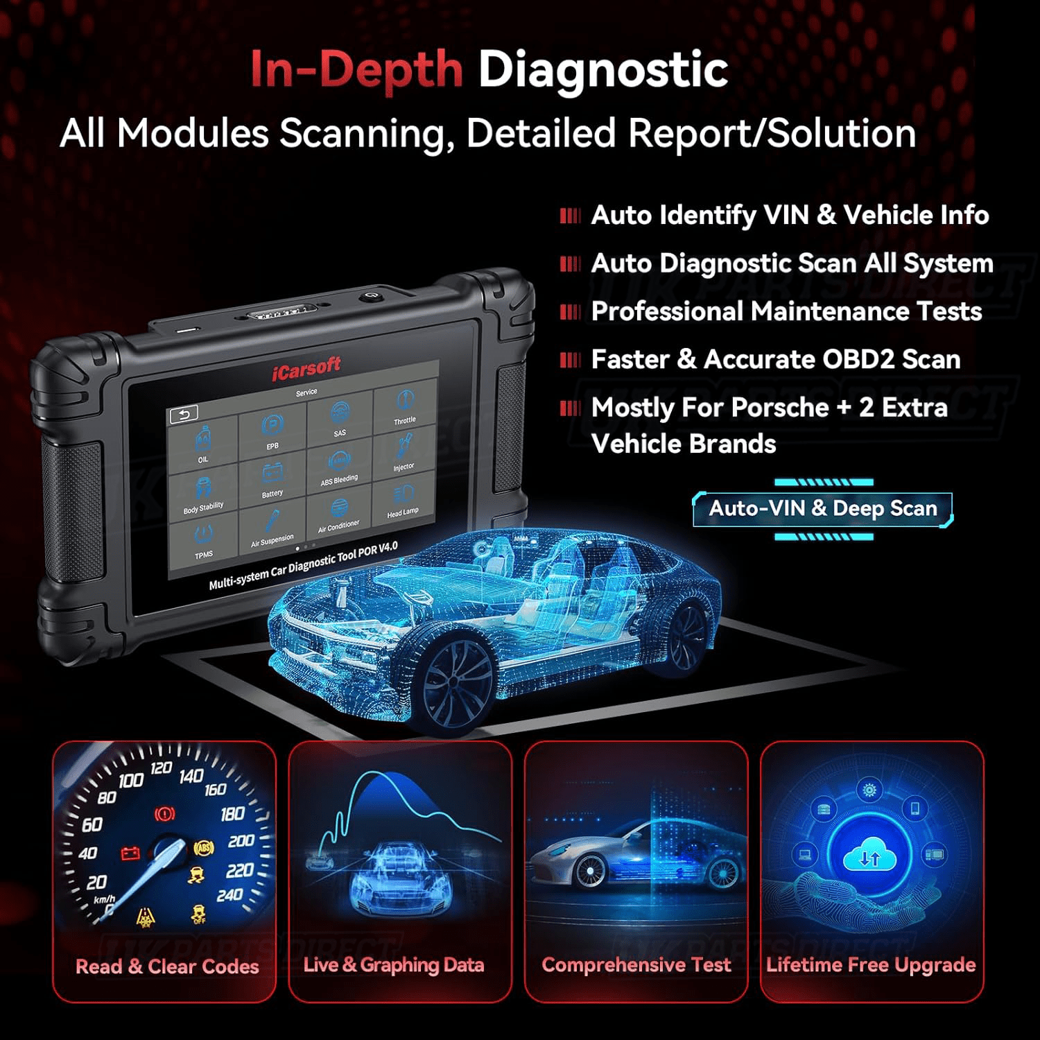 - Read, Diagnose and Clear Extensive Diagnostic Trouble Codes (DTC's) including Engine, Auto Transmission, ABS, Airbag, Air Suspension and so so much more