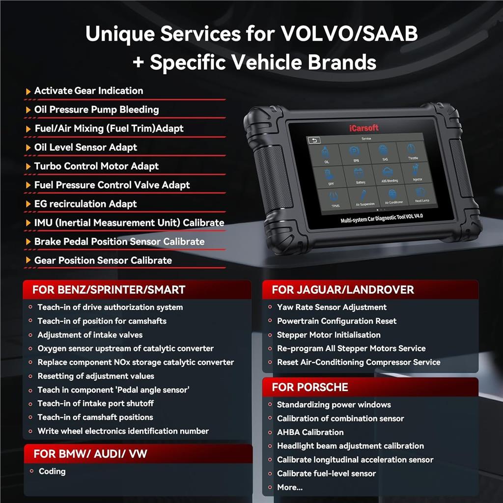 Air Suspension (SPS)The iCarsoft V3.0 will allow you recalibrate the Air Suspension System after replacing components like sensors or the compressor - to ensure the system properly recognizes the new parts and functions correctly at the intended ride height. Essentially, it allows the system to relearn its optimal settings following a repair or modification (it will however not allow you to modify the ride height from factory settings) on supported models.