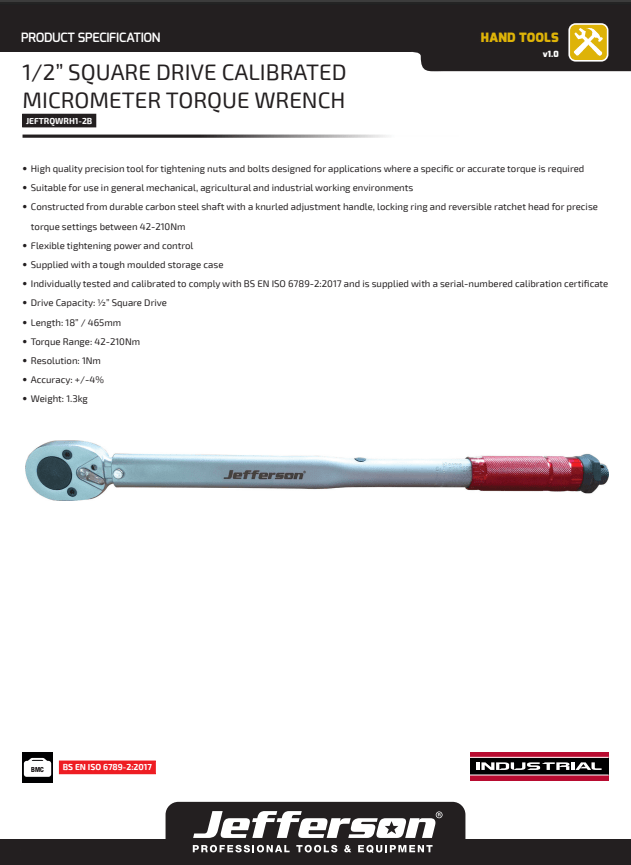 Jefferson 1/2" Square Drive Calibrated Micrometer Torque Wrench - JEFTRQWRH1-2B
