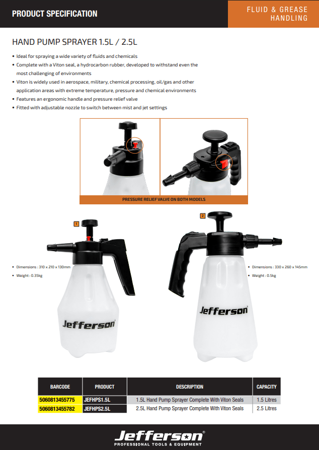 Jefferson 1.5L Brake Cleaner Hand Pump Chemical Sprayer with Viton Seals - JEFHPS1.5L