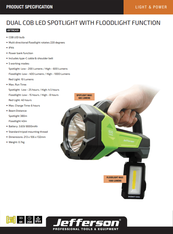 Jefferson 1000 Lumens Dual COB LED Spotlight with Floodlight Function - JEFTRCH31