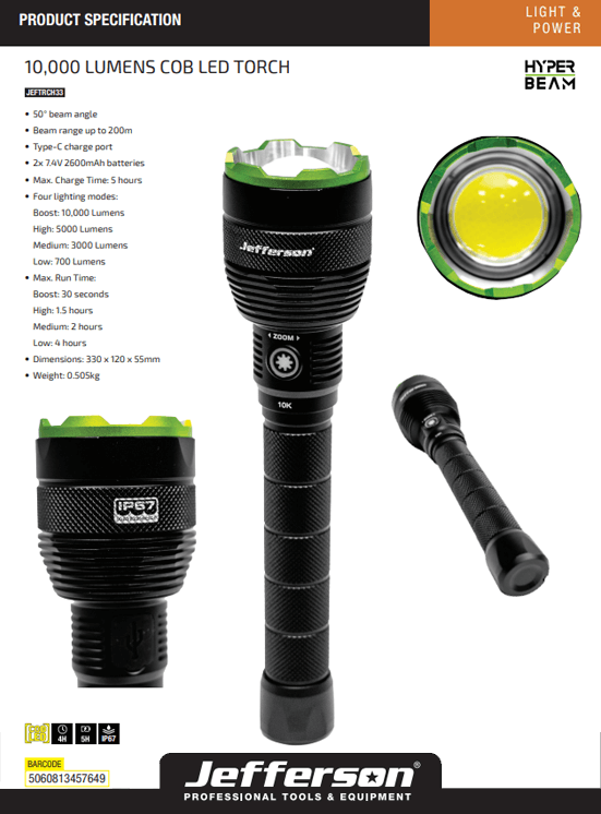 Jefferson 10000 Lumens COB LED Torch - JEFTRCH33