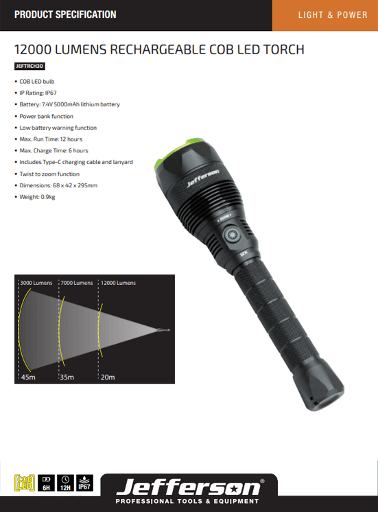 Jefferson 12000 Lumens COB LED Torch - JEFTRCH30