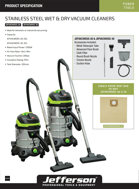 Jefferson 1200W 20 Litre Stainless Steel Wet and Dry Vacuum Cleaner 230V - JEFVACWDSS-20