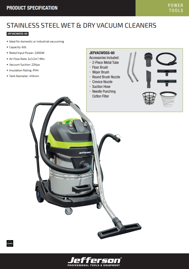 Jefferson 1200W 60 Litre Stainless Steel Wet and Dry Vacuum Cleaner 230V - JEFVACWDSS-60