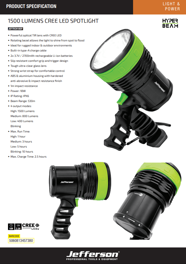 Jefferson 1500 Lumens Cree LED Spotlight - JEFTRCH18SP