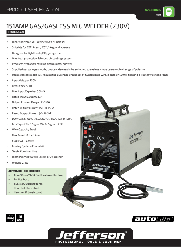 Jefferson 151 AMP Gas / Gasless MIG Welder 230V - JEFMIG151-AM