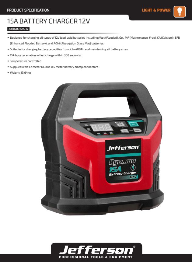 Jefferson 15A Battery Charger 12V | Smart / Intelligent | 20A BOOST - JEFBATCHG15-12