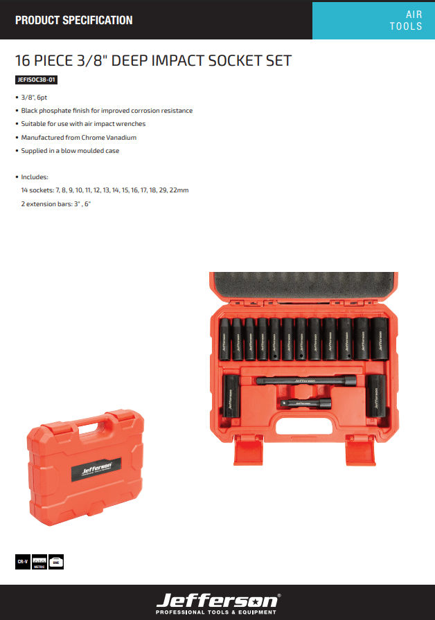 Jefferson 16 Piece 3/8'' Deep Metric Impact Socket Set - JEFISOC38-01