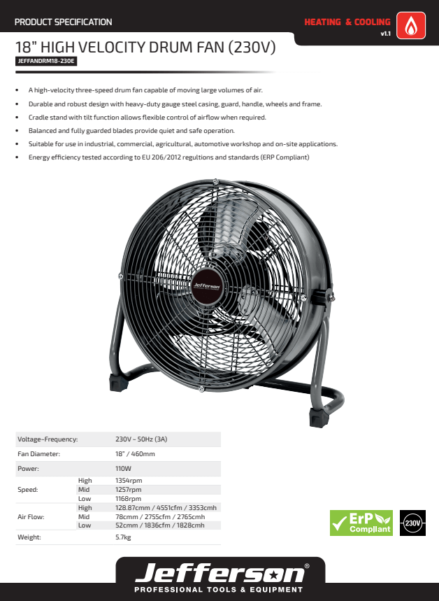 Jefferson 18" High Velocity Drum Fan 230V - JEFFANDRM18-230E