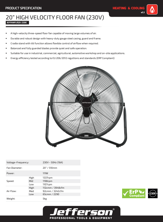 Jefferson 20" High Velocity Floor Fan 230V - JEFFANFLR20-230E