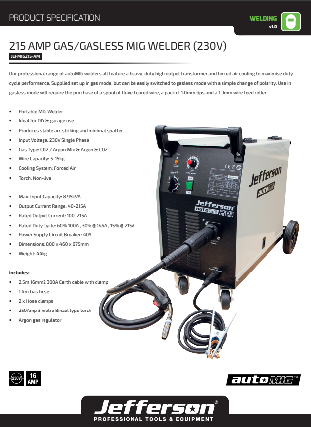 Jefferson 215 AMP Gas / Gasless MIG Welder 230V - JEFMIG215-AM