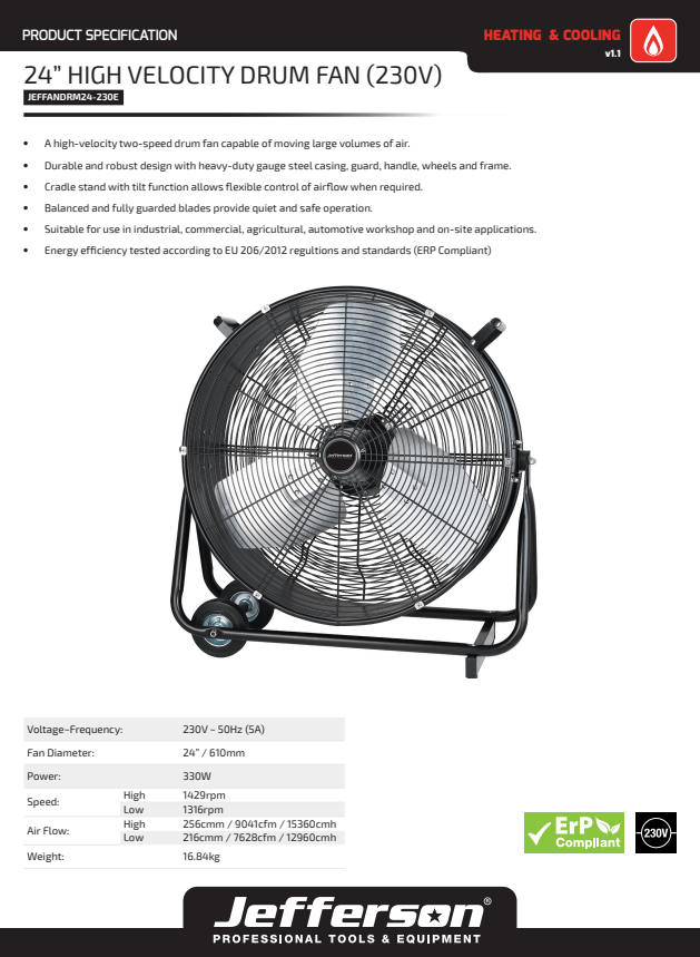 Jefferson 24" High Velocity Drum Fan 230V - JEFFANDRM24-230E