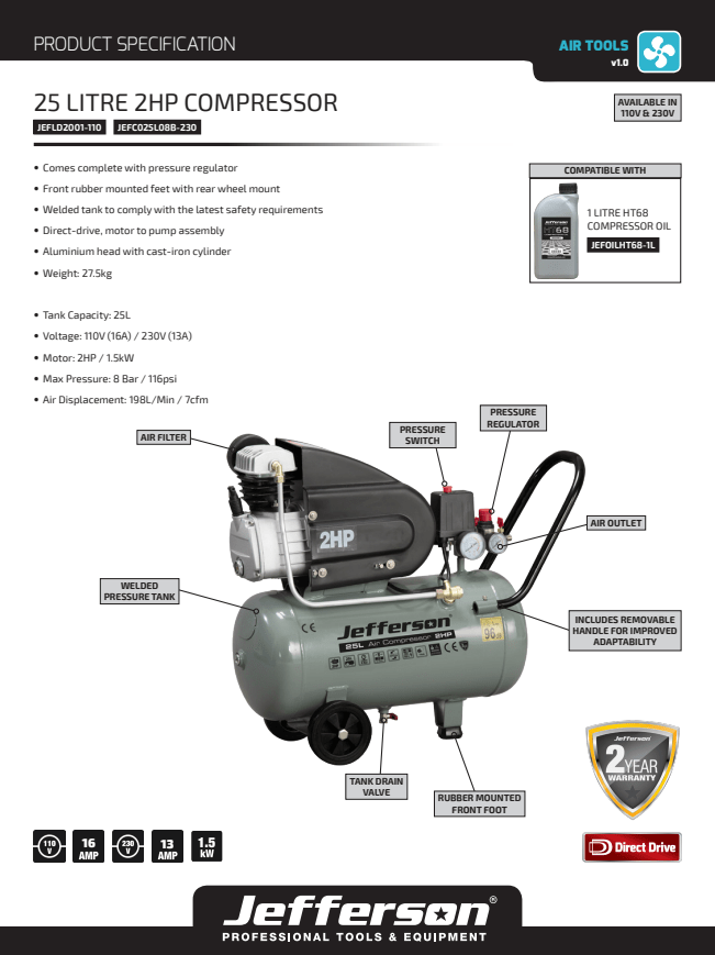Jefferson 25 Litre 2HP Compressor 110V | 8 BAR | 2 YEAR WARRANTY - JEFLD2001-110