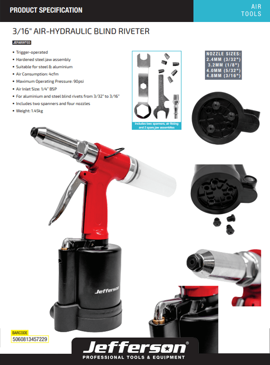 Jefferson 3/16" Air Hydraulic Blind Rivet Riveter Gun (2.4 - 4.8mm) - JEFARIVT03