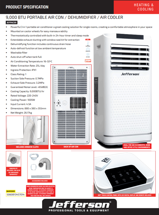 Jefferson 3 in 1 Portable Air Conditioner / Dehumidifier / Air Cooler / Heater - JEFPAC09