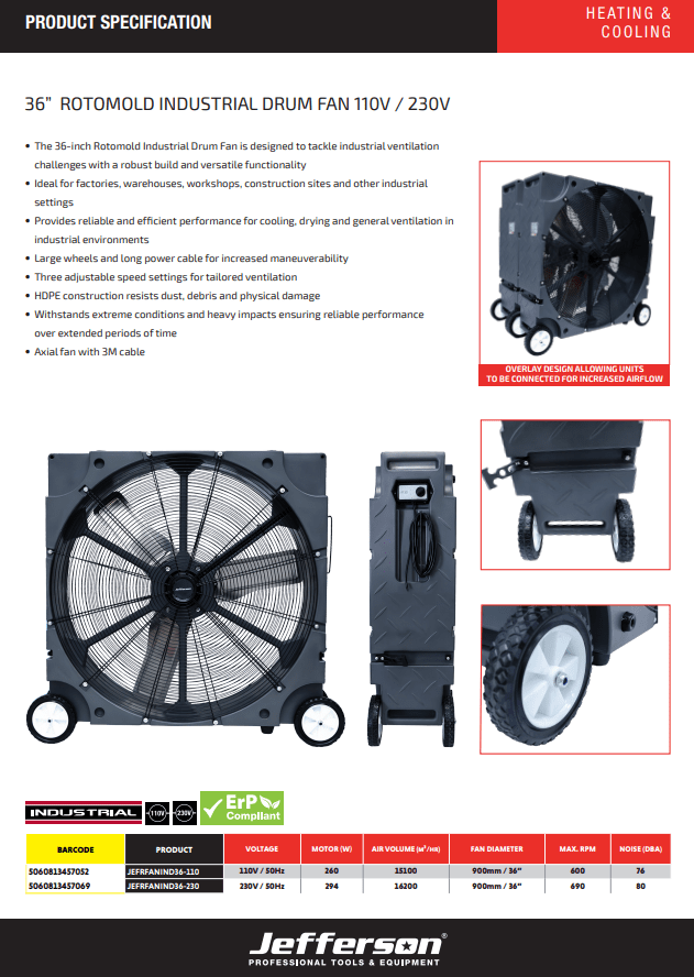 Jefferson 36" Rotomould Industrial Drum Fan 110V - JEFRFANIND36-110