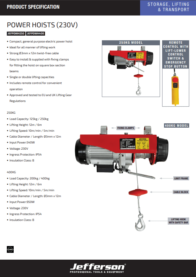 Jefferson 400kg Power Hoist (230V) with Remote Control | 950W MOTOR - JEFPOWH400