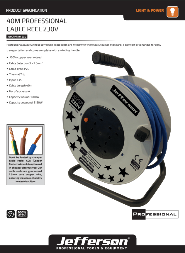 Jefferson 40m 230V Extension Lead Cable Reel with 4 Sockets IP44 - JEFCRPR40-230