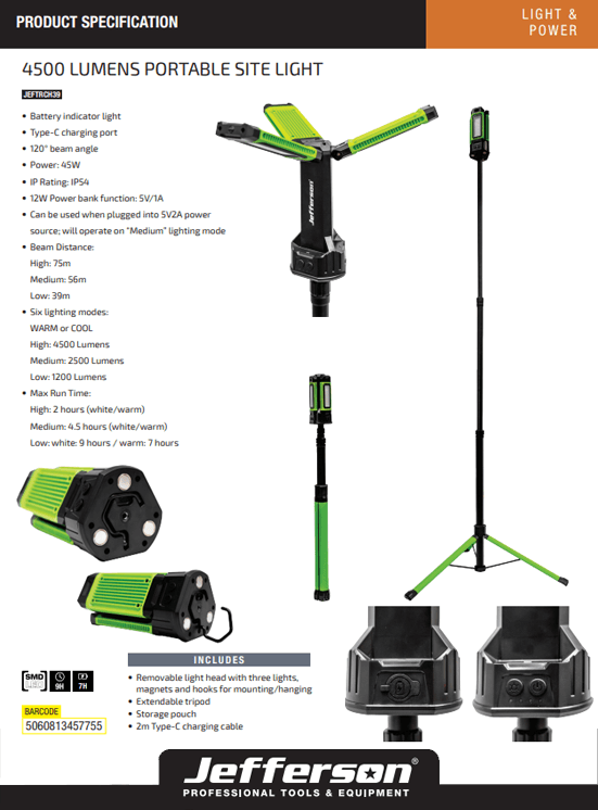 Jefferson 4500 Lumens Portable Site Light with Tripod - JEFTRCH39