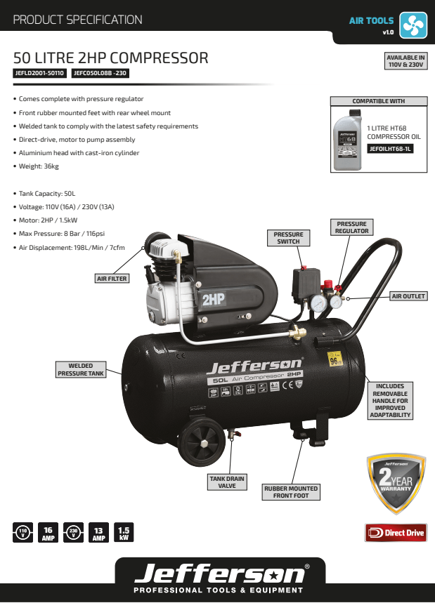 Jefferson 50 Litre 2HP Compressor 110V | 8 BAR | 2 YEAR WARRANTY - JEFLD2001-50110