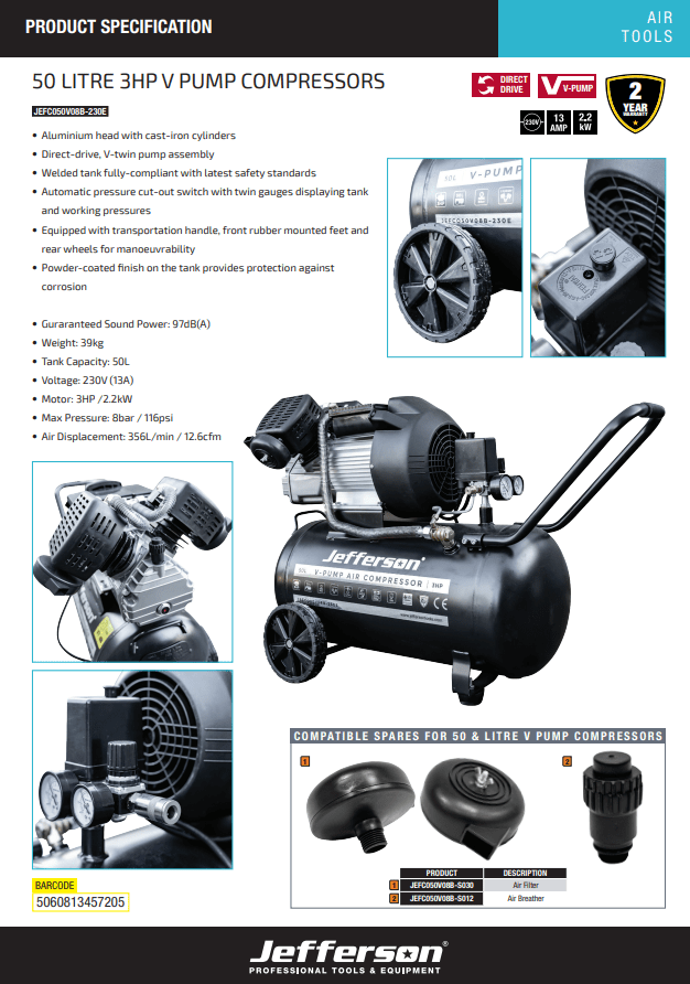 Jefferson 50 Litre 3HP V Pump Compressor 230V | 8 BAR| 2 YEAR WARRANTY - JEFC050V08B-230E