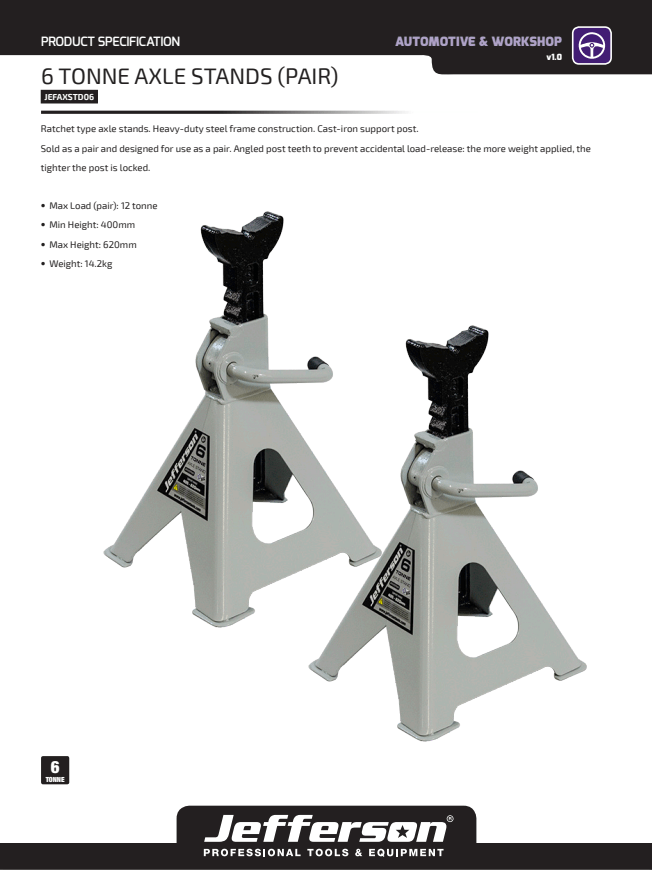 Jefferson 6 Tonne Axle Stands Ratchet | HEAVY DUTY for Car / Van / Caravan - JEFAXSTD06
