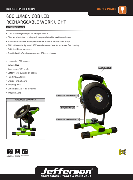 Jefferson 600 Lumens COB LED Work Light - JEFWLT10W-230RCH