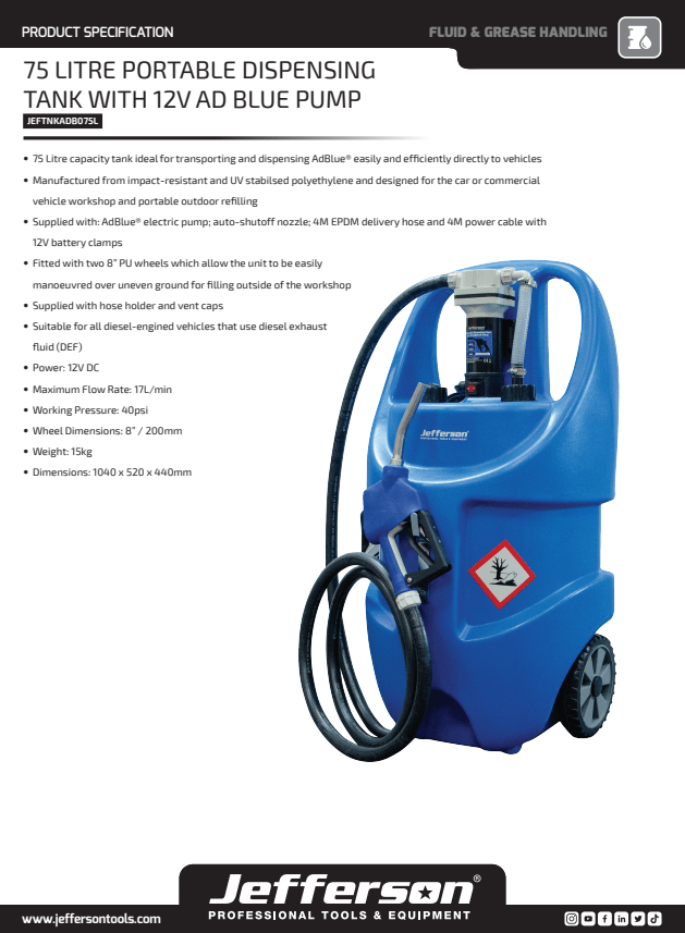 Jefferson 75 Litre Portable AD Blue Dispensing Tank with 12V Pump - JEFTNKADB075L