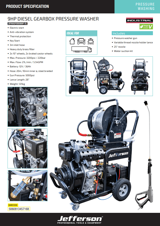 Jefferson Gearbox Diesel Power Pressure Jet Washer | 9HP 3200Psi - JEFWASPGR090HP-DL