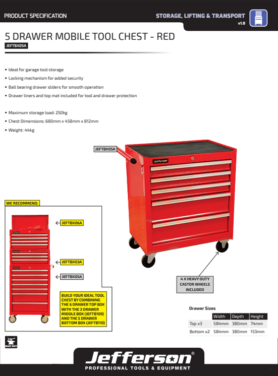 Jefferson Red 5 Drawer Mobile Bottom Tool Chest Box | BALL BEARING RUNNERS - JEFTBX05A