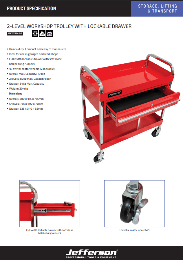 Jefferson Red Heavy Duty 2-Level Trolley with Lockable Drawer | 195KG CAPACITY - JEFTTROL02