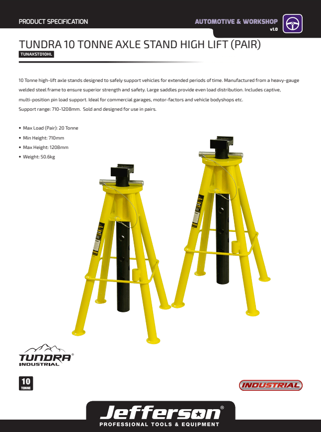 Jefferson Tundra 10 Tonne High Lift Axle Stands (PAIR) - TUNAXSTD10HL