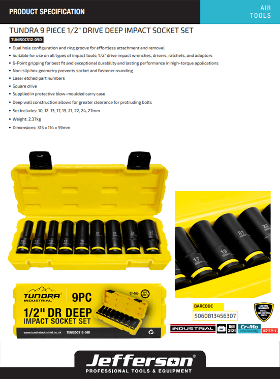 Jefferson Tundra 9 Piece 1/2'' Drive Deep Impact Socket Set - TUNISOCS12-09D